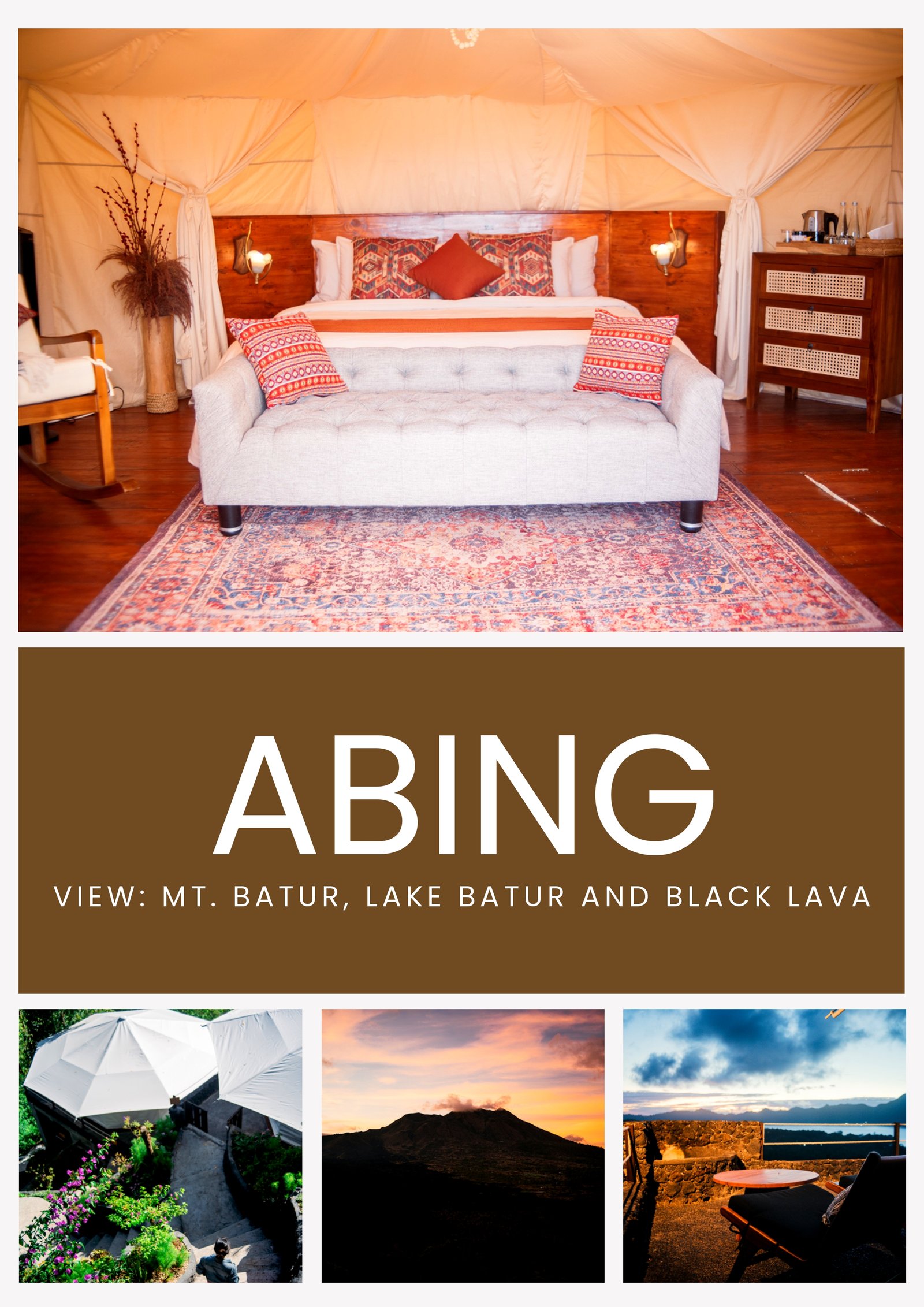 Abing is the crown jewel of Alam Caldera, a spacious tent with premium amenities and panoramic views of Mt. Batur, Lake Batur, and the black lava field. With a wide bed, standing air cooler, private bath, and high-end touches, this tent delivers a full experience of glamping luxury. Every corner is designed for comfort, offering a peaceful yet lavish stay in the highlands. For the most luxurious experience, the Abing Tent features an extensive set of high-end amenities to ensure ultimate comfort:
