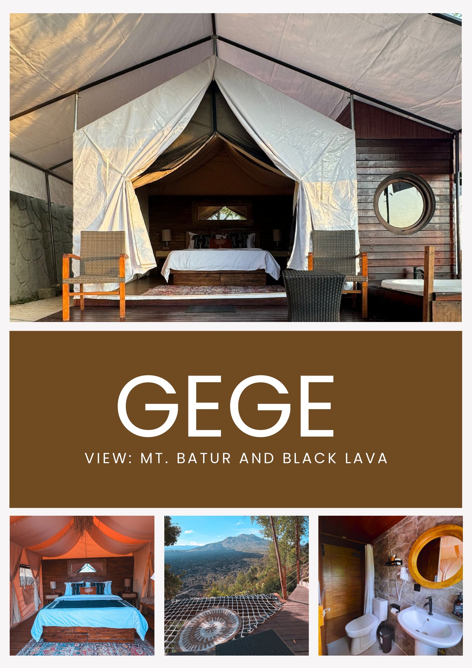 Spacious and tranquil, Gege Tent offers a refined glamping experience for guests who enjoy a bit of extra room to breathe. Overlooking Mt. Batur and the black lava fields, the tent features a private bath and thoughtful touches that blend luxury with wilderness. Whether you're lounging with a book or enjoying breakfast in bed, Gege gives you the space to fully relax and recharge. Inside, you'll find well-appointed facilities that combine rustic charm with refined convenience: