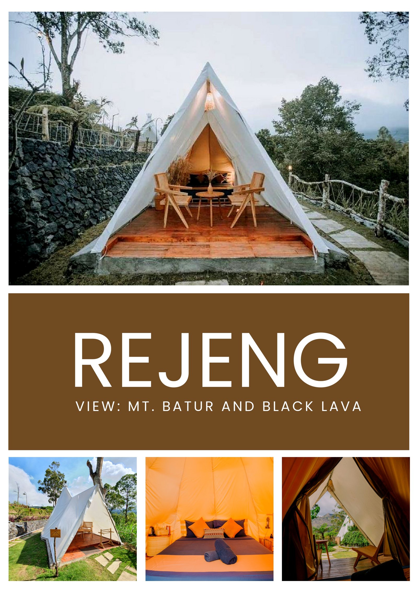 The Rejeng Tent offers a bold and earthy glamping experience with direct views of Mt. Batur and the dramatic Black Lava landscape. Whether you're gazing out at the sunrise or sipping warm tea in the cool morning air, this tent immerses you in the volcanic charm of Kintamani. Its inviting atmosphere makes it a perfect hideaway for nature enthusiasts and adventure seekers. This tent is thoughtfully outfitted with practical amenities to make your mountain retreat both restful and convenient: