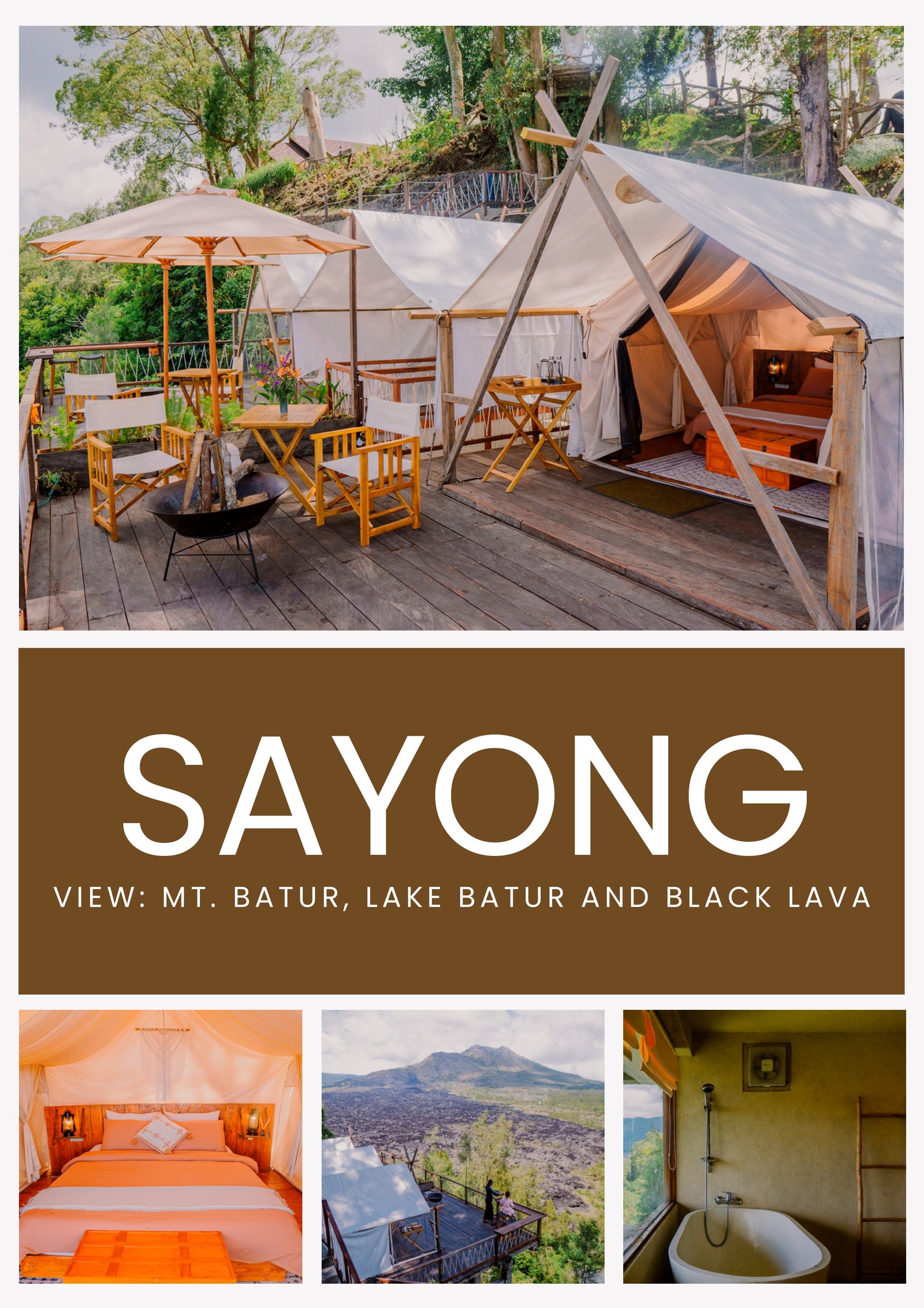 Sayong Tent is where comfort meets the outdoors, combining natural beauty with elevated amenities. With a private bathroom, bathtub, and breathtaking panoramic views of Mt. Batur, Lake Batur, and the surrounding black lava, this tent is perfect for those who seek peace and privacy. Whether it's a romantic getaway or a self-care weekend, Sayong sets the tone for a luxurious escape. Enjoy your escape with a full range of modern comforts designed to elevate your stay in the Sayong Tent: